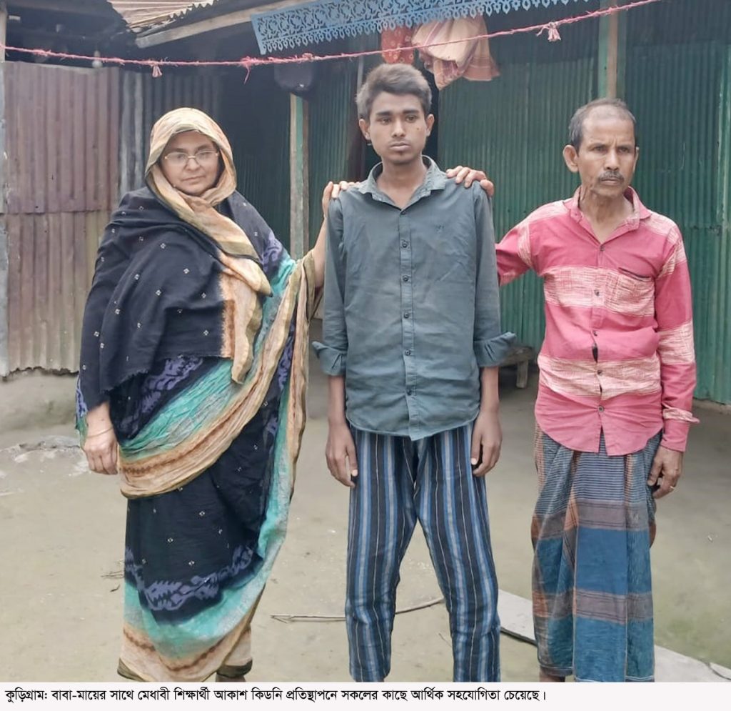 সরজমিনে গিয়ে কথা হয় জেলার পৌরসভা এলাকার সর্দারপাড়া গ্রামের দিনমজুর হোসেন আলীর ছেলে মো. আকাশ এর সাথে। ইতিমধ্যে তার সুন্দর চেহাড়ার মধ্যে ক্লান্তভাব ছুঁয়ে গেছে। কিছুটা হতাশ ও অভিমানি চোখে তাকিয়ে আছে সে। প্রতিবেশী ও তার পরিবারের আপনজনদের সাথে দীর্ঘক্ষণ কথা বলে জানা গেল, ২০২৪ সালের ২৮ অক্টোবর দুটো কিডনি বিকলের ঘটনা ধরা পরে কুড়িগ্রাম জেনারেল হাসপাতালে চিকিৎসা নিতে এসে। এরপর তাকে রংপুর মেডিকেল কলেজ হাসপাতালে নেয়া হয়। সেখানে পরীক্ষা-নিরীক্ষার পর দুটো কিডনিই বিকলের রেজাল্ট আসে। সেই বছরের ডিসেম্বর মাস থেকে তাকে ডায়ালেসিস দেয়া হচ্ছে। ইতিমধ্যে বিভিন্ন পরীক্ষা-নিরীক্ষা ও ১৮০টি ডায়েলিসিসে প্রায় ১৭ লক্ষ টাকা ব্যয় হয়েছে। এজন্য পরিবারের মাথা গোঁজার ৮শতক জমির মধ্যে ৪শতক জমি বিক্রি করে দেয়া হয়েছে। আকাশের বাবা হোসেন আলী হার্টের রোগী হওয়ায় তার কাজকর্ম বন্ধ হয়ে গেছে। ফলে অর্থনৈতিকভাবে পঙ্গু পরিবারটি আকাশের চিকিৎসা চালিয়ে যেতে পারছে না। ঢাকার সিকেডি এন্ড ইউরোলজি হাসপাতালের চিকিৎসক ডা. বাহারুল ইসলামের তত্বাবধানে আকাশের কিডনী প্রতিস্থাপনে তার বোনের কিডনির সাথে ম্যাচ করায় আশার আলো দেখা গেলেও কিডনি প্রতিস্থাপনের জন্য অর্থ সংগ্রহ করতে না পারায় থমকে গেছে চিকিৎসা কার্যক্রম। এই মুহুর্তে অসহায় পরিবারটি তাকিয়ে আছে সরকারি-বেসরকারি বিভিন্ন দাতা প্রতিষ্ঠান, বিত্তবান মহৎ ব্যক্তি ও প্রবাসী ভাইদের প্রতি!